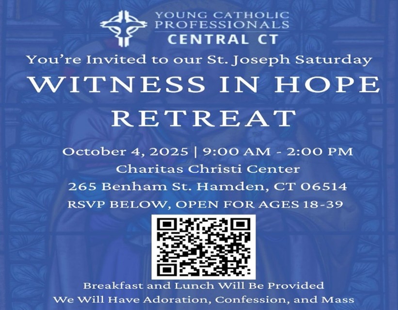 Archbishop Coyne will celebrate the Vigil Mass and Bishop Richard F. Reidy will deliver the homily. There will be inspiring talks, confessions, eucharistic Adoration, exhibiors, fellowship and the Mass. Tickets may be obtained at www.ctcatholicmen.org. The cost per ticket is $45. Speakers: Dr. Ray Guarendi, Catholic psychologist and host on EWTN, Fr. Anthony Federico, Vocation Director for the Diocese, Michael O’Neill, “The Miracle Hunter” of EWTN, and Fr. James Brooks, from Michigan who will offer a special room for prayer over attendees, especially those seeking physical or spiritual healing.