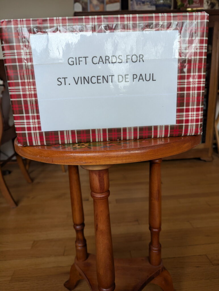 The CCD program collected $1,336 in gift cards for St. Vincent de Paul’s food bank to distribute to those in need. Margaret Mattei presented that donation to the food bank on behalf of the CCD program. Thank you so very much for your generosity. Thank you also for your continued food donations left at the side entrance. As you know, this is a tough time of year for many people. Your help is so necessary and so very thoughtful.