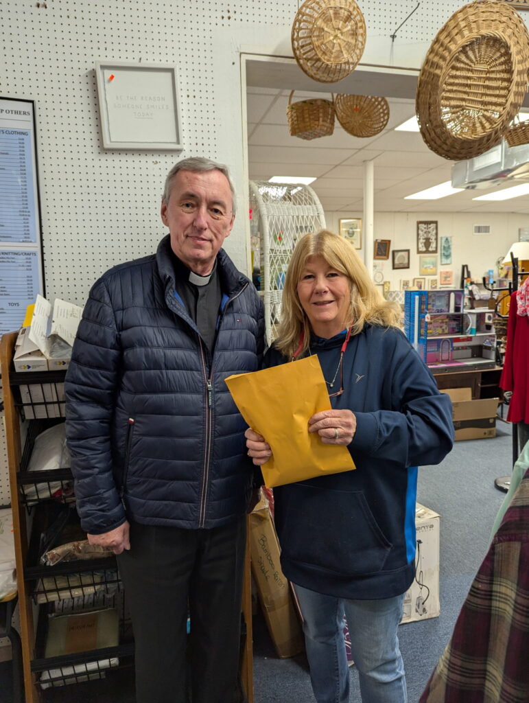 Saint Michael’s CCD Classes held a Gift Card drive for groceries to benefit St. Vincent de Paul’s food bank. This wonderful effort raised $1336. Shown are Cindy Barbian, Manager for St. Vincent de Paul and Father Marek Sobczak, Vicar for St. Michael’s. Also in attendance was Margaret Mattei, Director of the CCD program for St. Michael’s. God bless all who gave to this special drive and their commitment to helping those in need.