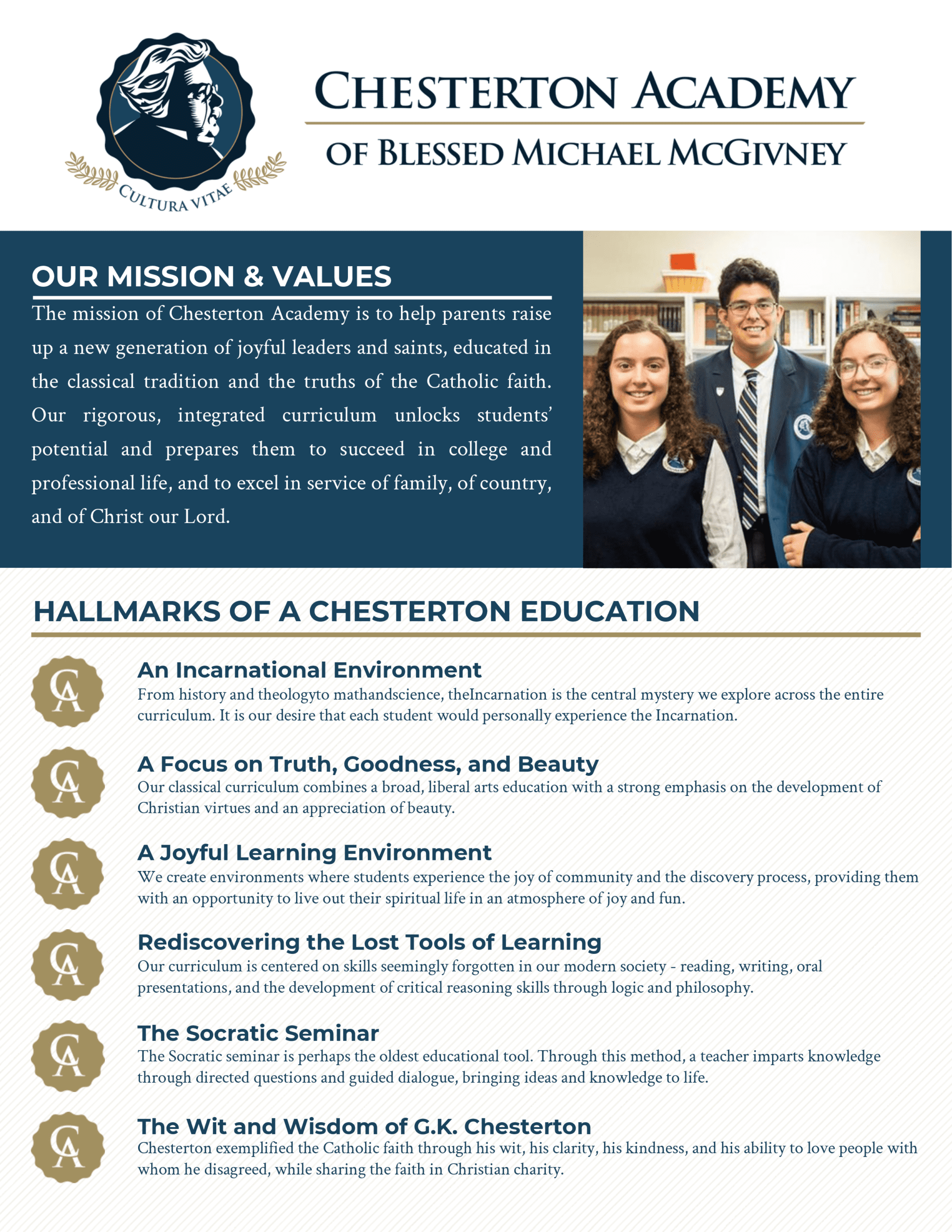 Chesterton offers an affordable High School experience that is community-oriented, engaging, and rooted in virtue and the Classical Catholic traditions. Chesterton High School provides an academically rigorous, joyful, and faith-filled environment where learning and faith are meaningfully connected. Please take a few moments and submit a free application to Chesterton today!